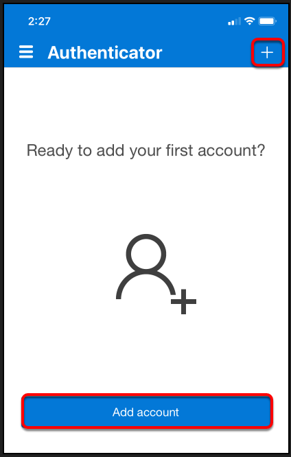Once the application is installed on your phone, open it and you should be presented with the following screen. If you already have the Microsoft Authenticator on your phone from school or another company, you will only have the "+" option because this page becomes a list of registered accounts after the first account is created.