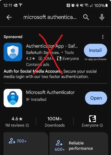 Once you get to this screen, open your phone and navigate to the Google Play store or the Apple App Store. Search for "Microsoft Authenticator" and install the application. Please be aware that in both stores, there is currently an authenticator app that is not published by Microsoft outranking the Microsoft and Google authenticators. Choose the authenticator published by Microsoft Corporation.