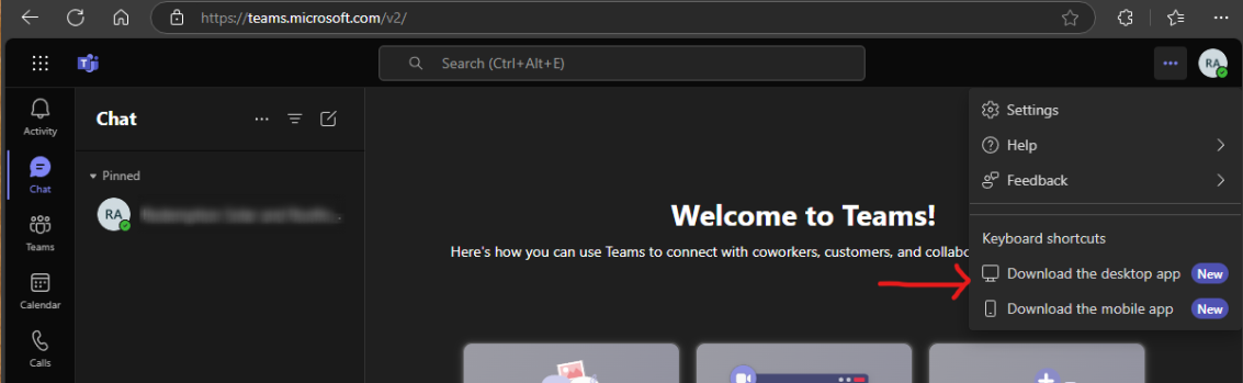 Log in to the Teams application and download the desktop Teams app. It is generally better than the web-based version when it comes to accessing your microphone, camera and speakers. The download link shown below will take you to a web page where you can download the desktop client.